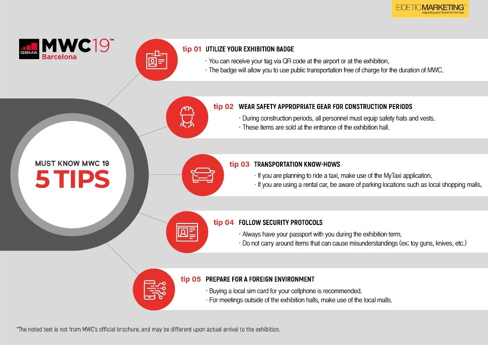 Along with CES and IFA, MWC (Mobile World Congress Barcelona) is one of the top 3 global IT/Wireless expositions. Over 2,100 global IT companies participate in the exhibition, including world renown brands like Google, Microsoft, Samsung, LG, Huawei and more. During 2018’s MWC in February, there were more than 104 thousand participants, and this number continues to grow every following year. As the 4th quarter of the year is passing by, more clients are starting to have queries about the MWC. As an experiential global marketing agency that has participated in the MWC, Eidetic Marketing will offer 5 must know tips for MWC participants.